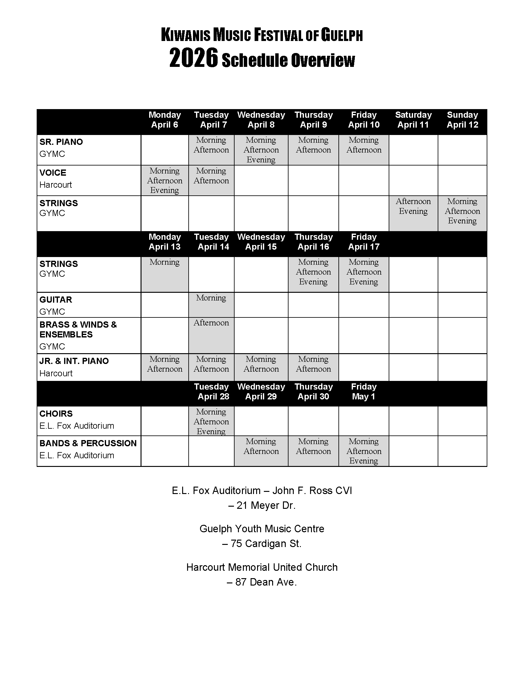 Boxes in gray indicate dates and sessions when classes will be scheduled for the corresponding discipline.
